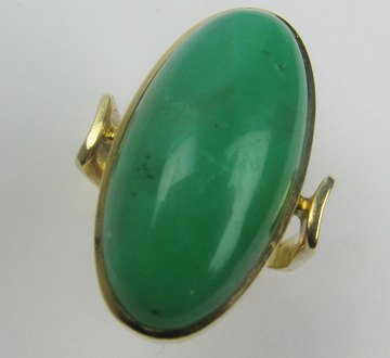 Ring af 14 kt. guld, prydet med cabochonslebet jade på 29 x 15 mm., samlet vægt ca. 15 gr. Ring Str. 57. Håndfremstillet hos guldsmed Erik Steen Solodziuk - Copenhagen/Lyngby, efter 1973.