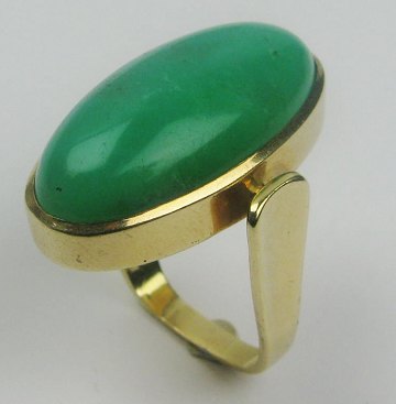 Ring af 14 kt. guld, prydet med cabochonslebet jade på 29 x 15 mm., samlet vægt ca. 15 gr. Ring Str. 57. Håndfremstillet hos guldsmed Erik Steen Solodziuk - Copenhagen/Lyngby, efter 1973.