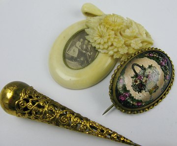 Lot bestående af amulet vedhæng og vedhæng af ben, forgyldt hattenål, broche af sølv og broche med "hinterglas" dekoration samt armring. Sølvbroche L. ca. 10 cm., vægt 23 gr. alle dele fra omkring år 1900.