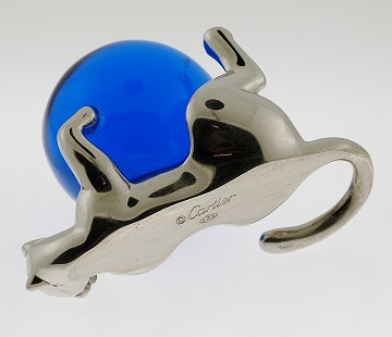 Dekorationsstykke fra Cartier, udført i form af panter på ryggen, legende m. en safirblå glaskugle, stemplet "Cartier 925S". L. 5,6 cm.