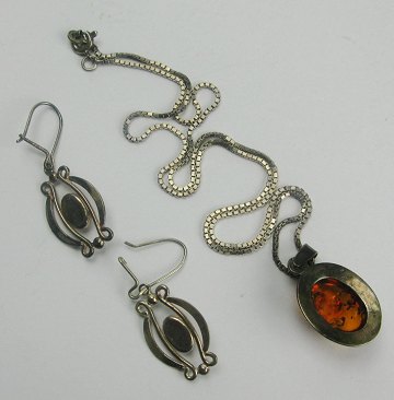 Rav smykkesæt af sterling sølv bestående af et halssmykke og et par ørelokker, alle dele prydet med cabochonslebet rav. Halskæde L. 42 cm. ørelokke L. 3,5 cm.