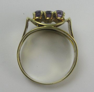 Ring af 14 kt. guld, prydet med 6 diamantslebne ametyster. Ring str. 50, samlet vægt 3,3 gr. Lille Bismarck armlænke og et par Bismark ørelokker af gulddoublé medfølger.