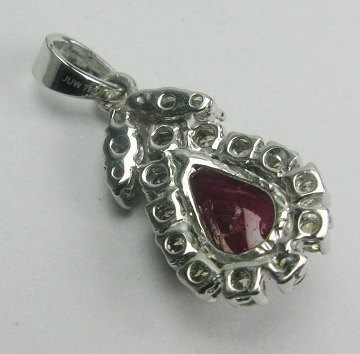 Vedhæng af 18 kt. rhodineret hvidguld, prydet med dråbeformet rubin på 2,06 ct. samt 19 brillantslebne diamanter, samlet ca. 0,20 ct. L. ca. 18,5 mm. Samlet vægt 3,8 gr.