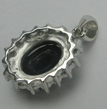 Vedhæng af 10 kt. rhodineret guld, prydet med facetsleben safir på ca. 9 x 7 mm., omkranset af 16 brillantslebne diamanter på tilsammen ca. 0,10 ct. L. ca. 15 mm., vægt 2,3 gr.