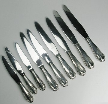 9 stk. sjældne Georg Jensen knive dess. Viking/Nordisk nr. 6, bestående af 6 middagsknive og 3 frokostknive. L. henholdsvis 24,5 og 19,5 cm. Fremstillet hos Georg Jensen fra 1927.