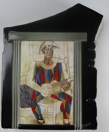 Vase af keramik i form af flise med påtryk i form af to kopierede Picasso skilderier. Fremstillet hos Goebels (c) i serien Artis Orbis. H. 25,5 cm.