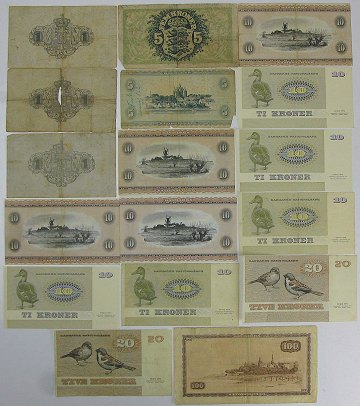 Lot danske sedler, bestående af: 1 kr 1918,-21(2), 5 kr 1942,-59, 10 kr 1973(3),-74,-76,-77(3),-78, 20 kr 1979,-81 samt 100 kr 1965. Ialt 17 stk.