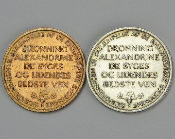 Medailler af messing og sølv, præget i forbindelse m. indsamlingen til Rigsforeningen til bekæmpelse af de rheumatiske sygdomme, for hvilken dronning Alexandrine var protektor. Ø. 31,5 mm.