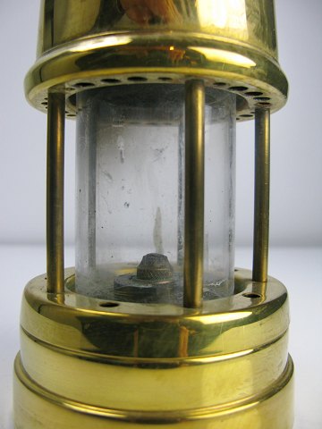 Grubelampe af messing fra Britisg Coal Mining Company Wales, serienr. 279178. H. 23 cm.