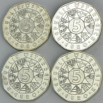 Østrig, 5 euro SØLV 2003,-05,-10(2) - KM 3105, 3117, 3192, 3193