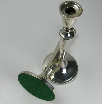 Par polske lysestager af sølv på rund fodstykke, herover profileret stamme. Udfyldte fodstykker. Stemplet med kvindehoved, flankeret med 3 og K. H. 21,5 cm. 20. årh.