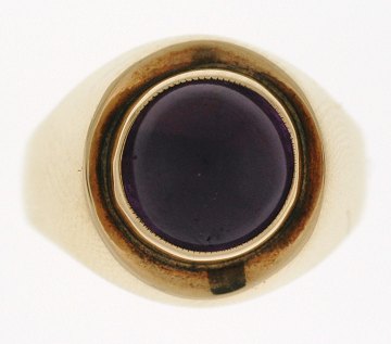 Ring fra Han Jensen & Co, Aarhus af 14 kt. guld, prydet m. cabochonsleben ametyst. Stemplet "H.J. 585". Str. 51.