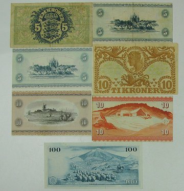 Lot skandinaviske sedler, bestående af: Danmark, 5 kr 1942,-54,-60, 10 kr 1937,-70, Færøerne, 10 kr 1954-78 samt Island, 100 kr (1960-). Ialt 7 stk.