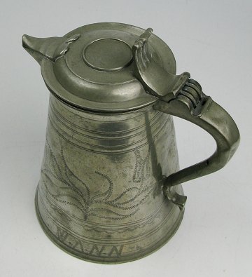 Norsk lågkrus af tin, punslet med omløbende dekorationer og bladværk samt inskription "Drick Min Wann". H. 20 cm.