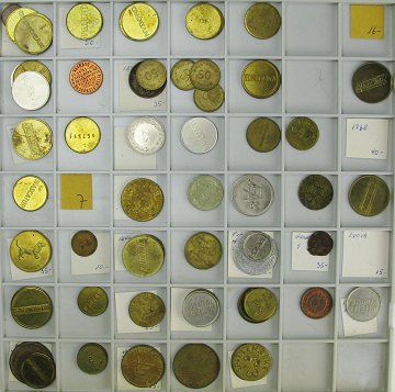 Lembit møntkassette med 8 skuffer, indeholdende stor samling jetoner, spillemærker, poletter med videre, i alt ca. 300 stk.
