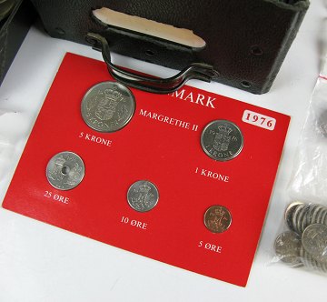 Lot bestående af arkivkasse med møntsæt 1976, div. hele og opbrudte møntruller samt poser med årgangsmønter, heriblandt 49 tk. 5 kr 1960 - 1984.