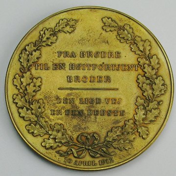 Fra brødre til en højtfortjent broder, 10 april 1912. Medailleur Sophus Lindahl. Diam. 55 mm.