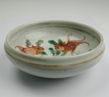 Kinesisk skål uden mærkning eller skrifttegn, dekoreret med tre guldfisk og søgræs. Diam. ca. 12 cm. 19. årh. tilskrevet.