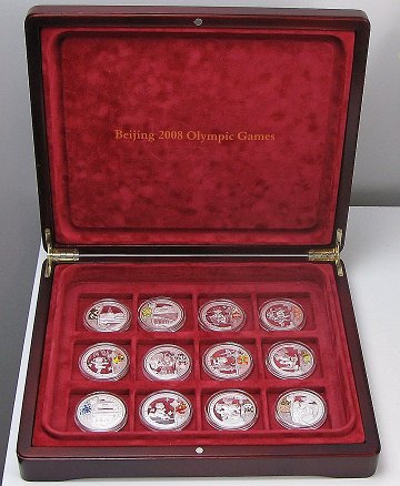 Kinesisk møntsæt, præget i anledning af OL i Beijing 2008, bestående af 12 stk. 1 ounce finsølvmønter m. multicolor-design.