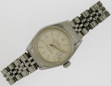 Damearmbåndsur fra Rolex, model Datejust, ref.nr.: 69174, i kasse og m. jubileelænke af stål, sølvfarvet skive m. stregindeks, datoangivelse ved 3" position, hvidguldslynette, safirglas, automatisk urværk. Fra 1990. Ø. 25,5 mm.