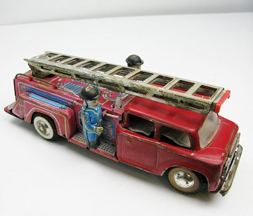 Legetøjsbrandbil af litograferet blik med skydestige og to brandmænd. Stigen afgiver ringelyd når den udtrækkes. L. 26 cm. Moden Toys Japan, ca. 1960.