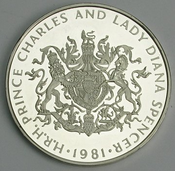 Medaille af sterlingsølv, præget í anledning af det royale bryllup mellem prins Charles og Lady Diana. Ø. 57,5 mm.