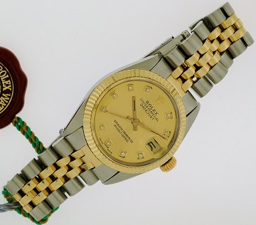 Midsizeur fra Rolex, model Oyster Perpetual Datejust, ref.nr.: 6827, i kasse og m. oysterlænke af 18 kt. guld og stål, champagnefarvet skive m. stregindeks, datoangivelse ved 3" position, guldlynette m. riflet kant, safirglas, automatisk urværk. Fra 1978. Ø. 30 mm.