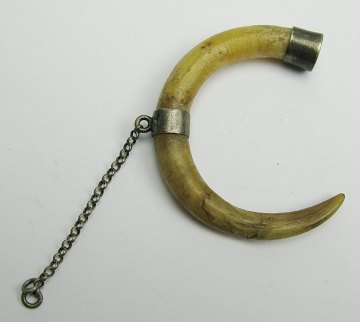 Klo, monteret med forsølvede manchetter og lille kæde. Kloen stammer formodentlig fra dovnedyr eller koala. L. ca. 12 cm., Diam. ca, 5,5 cm.