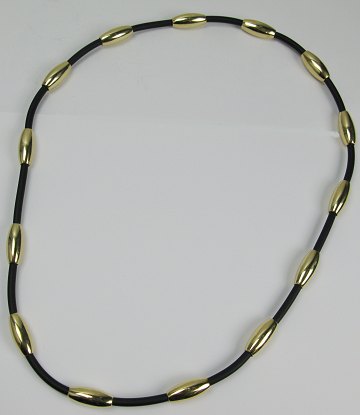 Håndfremstillet design halskæde af 14 kt. guld, bestående af 14 ovale, tøndeformede led, 25,7 x 11,6 mm., hvorimellem rundt gummibånd. L. 80 cm. Totalvægt 215 gr.
