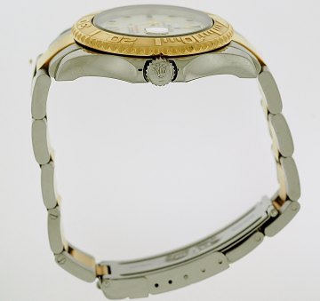 Midsizearmbåndsur fra Rolex, model Yachtmaster, ref.nr.: 168623, P-serie, i kasse og m. oysterlænke af 18 kt. guld og stål, justerbar guldlynette, hvid skive m. punktindeks, datoangivelse ved 3" position, safirglas, automatisk urværk. Fra 2000. Ø. 34 mm.