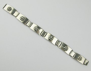 Armlænke af sølv fra 1950'erne med 6 hængslede led, prydet med blomst i relief. L. 20 cm. Vægt 42,9 gr.