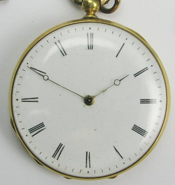 Lommeur i urkasse af 18 kt. guld med hvid emailleskive, romertal og stregindikation. Diam. 40 mm., totalvægt 43,5 gr. Urkæde i form af ankerkæde af kobber med lykkevedhæng.