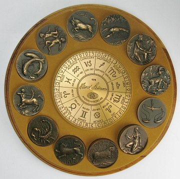 Komplet stjernetegnserie, alle prydet med "ædelsten" i form af smykkesten. I alt 12 medailler i tilhørende showcase af træ i original indpakning og med alle følgepapirer. Hver medaille Diam. 50 mm. Opbevaringssæk af ruskind til hver medaille medfølger.