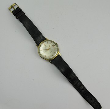 Vintage Omega Seamaster armbåndsur i urkasse af guld doublé. Champagnefarvet skive med stregindikation, central sekundviser og datovisning i #3 positionen. Automatisk værk, urkasse Diam. 33,5 mm. Hirsch læderrem.
