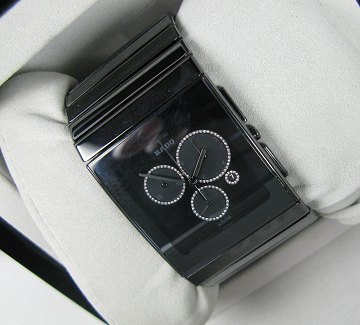 Rado Jubilé armbåndsur i urkasse og med lænke af High Tech keramik. Rektangulær sort skive bag safirglas med chronometerfunktioner, omkranset af talrige nanokrystal diamanter. Quartsværk. Urkasse 35 x 35 mm. Keramisk lænke med flip-lock sikkerhedslukke. Refenencenr. R21714182