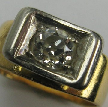 Ring af 18 kt. tofarvet guld med forhøjet front, prydet med brillantsleben diamant på 0,35 ct. Ring Str. 44½, samlet vægt 4,7 gr.