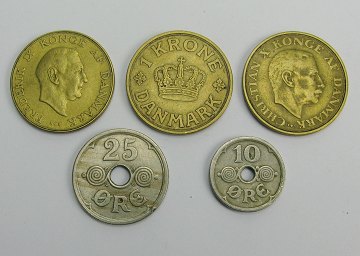 Danmark, 3x 1 kr samt Chr. X 25 øre og 10 øre (5)
