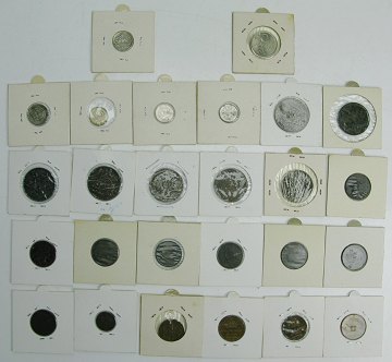 Etuier med diverse påtegninger. I alt 26 mønter.