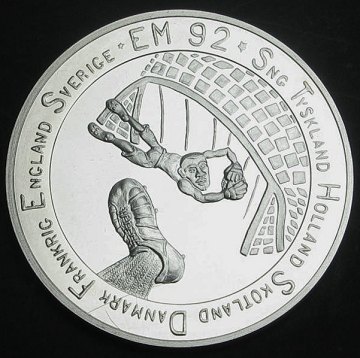 Medaille af finsølv, præget hos Den Kgl. Mønt i anledning af det danske europamesterskab i fodbold, 1992. Ø. 38 mm.