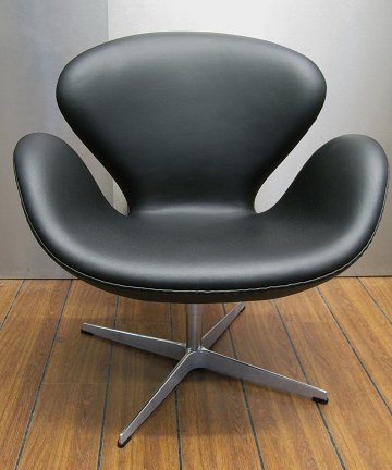 Arne Jacobsen hvilestol Svanen 3320, betrukket med sort savanna læder. Profileret aluminiumsfod med drejefunktion, skal formstøbt af fiberglasforstærket kunststof med skumpolstring.