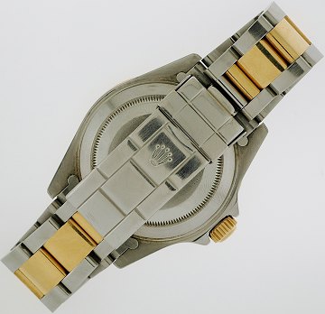 Herrearmbåndsur fra Rolex, model Submariner, ref.nr.: 16613, i kasse og med oysterlænke af 18 kt. guld/stål, champagnefarvet skive prydet med brillanter og facetslebne safirer, stregindeks, central sekundviser, datoangivelse ved 3" positionen, sort lynette med arabertal, safirglas, automatisk urværk. Uret er fra 1990. Urkasse 40 mm. i diameter