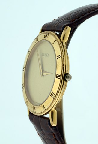 Herrearmbåndsur fra Gucci, i kasse af forgyldt og emailleret stål, gylden skive, monteret m. brun læderrem m. forgyldt spænde. Ø. 30 mm.