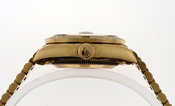 luksusmodel med præsidentlænke, safirglas, automatisk urværk, eftermonteret med krans prydet med brillanter og smaragder, diam. 26 mm.