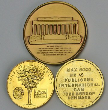 Medailler af metal, præget m. portræt af 3 af den amerikanske præsidenter, George Washington, Abraham Lincoln og Dwight D. Eisenhower. Ø. 38,1 - 51,2 mm.