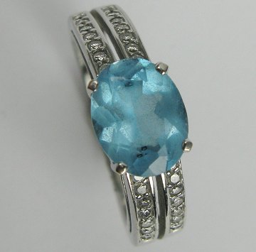 Ring af 14 kt. guld med forhøjet skinne, prydet med oval, facetsleben sten, flankeret af 4 rækker brillanter, tilsammen ca. 0,20 ct. Ring Str. 56, samlet vægt 4,4 gr.