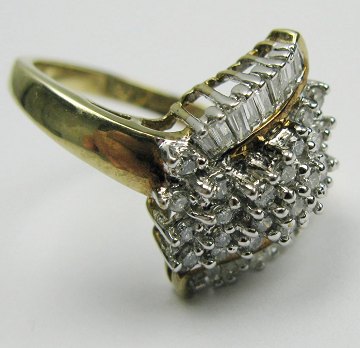Ring af 9 kt. guld med forhøjet, gennembrudt front, prydet med 18 trapez baquette slebne diamanter på samlet ca. 0,54 ct. I-L Top cristal-Top cape S12-13, samt 25 runde brillantslebne diamanter på ca. 0,42 ct. J-L Crystal-Top cape. Ring Str. 53, samlet vægt 4,2 gr.