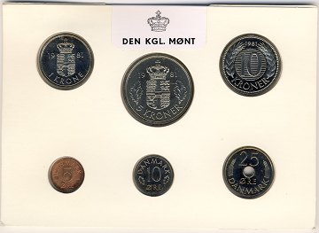 Møntsættet indeholder samtlige mønter i Danmarks møntserie: 10-, 5-, og 1-kr samt 25-, 10- og 5 øre.