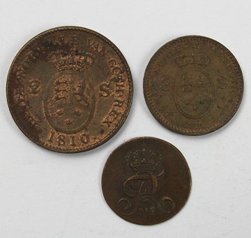 Frederik VI 2 skilling 1810 - H 9, Frederik VI 3 skilling 1812 - H 14 samt skilling 1812. Forstnævnte med halsafsnit i knækket linie.