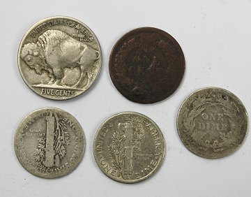Lot bestående af 5 cents 1913 - KM 133, 1 cent 1886, 2 x 1 dime 1917 og 1937 sølv samt Liberty dime 1884 sølv. 5 mønter i alt.