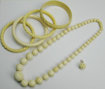 Smykkesæt, håndskåret af ben bestående af halskæde i forløb, L. 48 cm., 4 armringe, Diam. ca. 63 mm. samt vedhæng, Diam. 15 cm. Smykkerne er hjemtaget til Danmark omkring 1954.